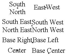 Defines the vertical and horizontal alignment of a text as: CD_NORTH, CD_SOUTH, CD_EAST, CD_WEST, CD_NORTH_EAST, CD_NORTH_WEST, CD_SOUTH_EAST, CD_SOUTH_WEST, CD_CENTER, CD_BASE_LEFT, CD_BASE_CENTER, or CD_BASE_RIGHT. Returns the previous value. Default value: CD_BASE_LEFT. Value CD_QUERY simply returns the current value.
