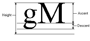 Returns the maximum width of a character, the line's height, the ascent and descent of the characters of the currently selected font. The line's height is the sum of the ascent and descent of a given additional space (if this is the case). All values are given in pixels and are positive. It is not necessary to provide all return pointers, you can provide only the desired values and NULL for the others.