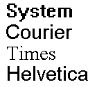 The library has at least 4 standard typefaces: "System" (which depends on the driver and platform), "Courier" (mono spaced with serif), "Times" (proportional with serif) and "Helvetica" (proportional without serif). Each typeface can have some styles: Plain, Bold, Italic and a combination of Bold and Italic. As an alternative to the standard typefaces, you can use other typefaces or native driver typefaces with the function NativeFont, but they may work in a reduced set of drivers.